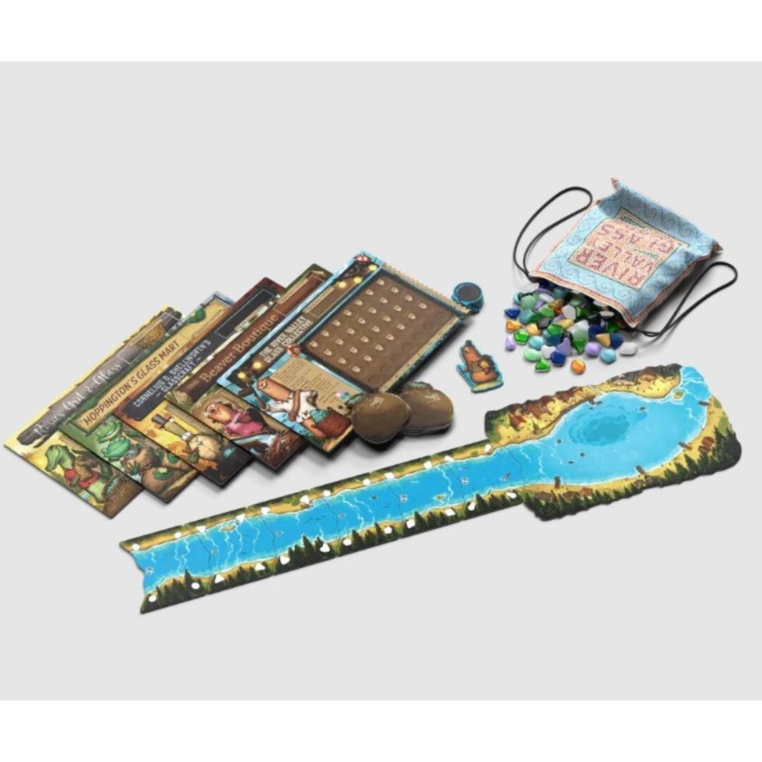 En River Valley Glassworks, juegas como uno de estos pioneros, extrayendo vidrio del mercado de fichas de río. Para ello, debes jugar una ficha de tu inventario al río. Cada ficha de río solo puede tener una forma específica, y debes jugarla en un espacio adyacente al lugar desde el que quieres extraer. Después de recoger tu vidrio, el río avanza, revelando nuevas piezas y nuevas oportunidades.