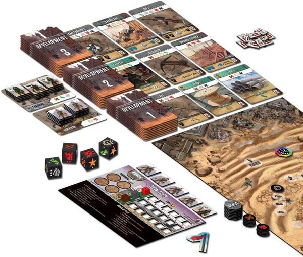 Remnants da vida a su entorno post-apocalíptico con rodamiento de dados en tiempo real para reunir recursos, un sistema de mercado con construcción de motores para desarrollar su compuesto, y un sistema de lucha impulsado por cartas para defenderse de los asaltantes y criaturas mutantes. Te enfrentarás a una amenaza de Nivel 1, una amenaza de Nivel 2 y luego a un Jefe Raider con un Power-Up único. Después del ataque final, el juego termina y el jugador con más puntos de Victoria es el ganador. Diseñado por Matthew O'Malley, Ben Rosset, y nuestro propio Justin De Witt, creador de Castle Panic y Hotshots.