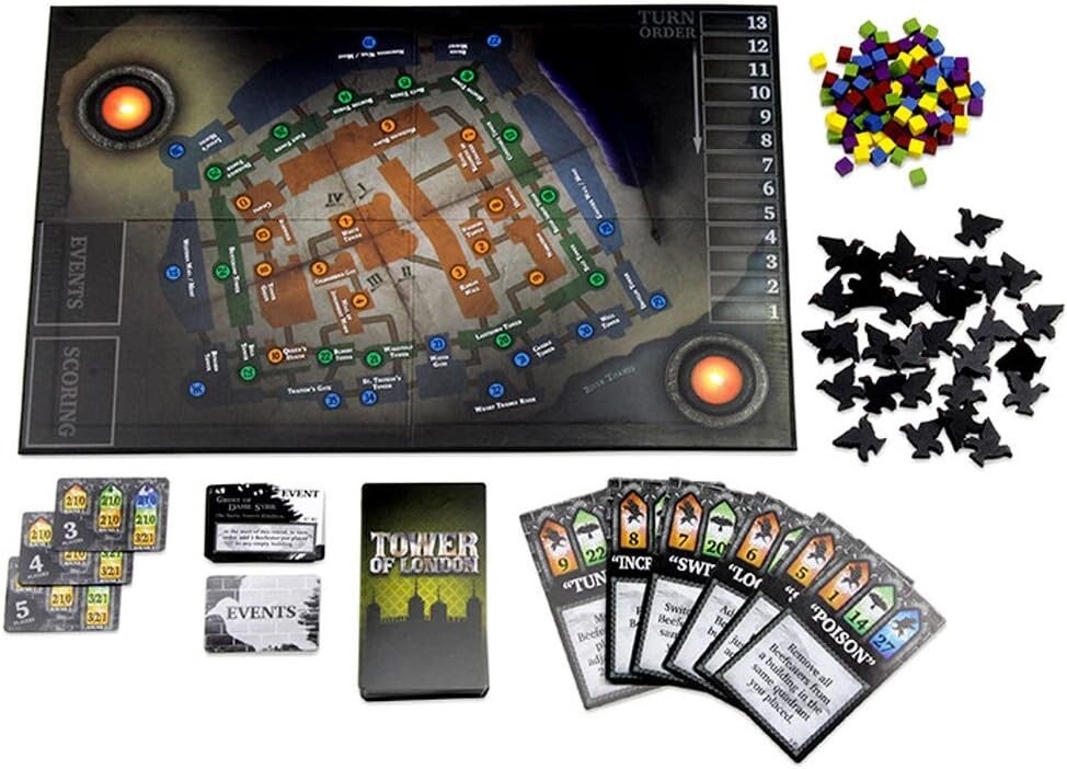 En la Torre de Londres , los jugadores luchan por el control de la torre usando su influencia para ocupar diferentes edificios y reunir cuervos. En cada turno, juegan dos cartas: la primera determina en qué edificio entra su Beefeater (guardia), y la segunda tiene un poder especial que se activa desde la perspectiva del Beefeater recién colocado.